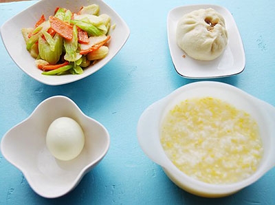 5、猪肉白菜豆腐粉条包+玉米小米粥+胡萝卜西芹炒马蹄+白煮蛋