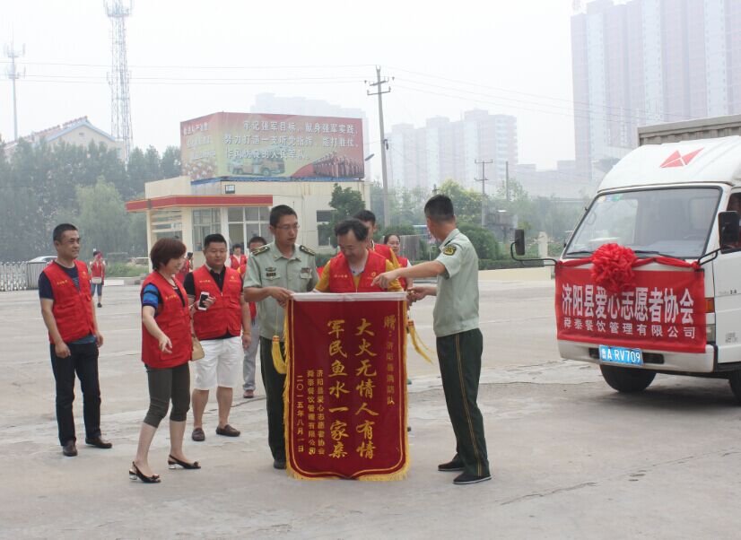 2015年八一建军节来临之际,济南舜泰餐饮管理有限公司携手济阳县爱心志愿者协会为济阳消防大队官兵送去锦旗和爱心物资。